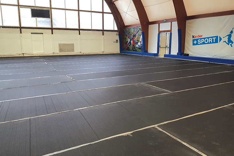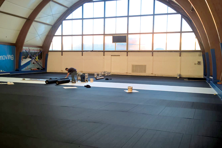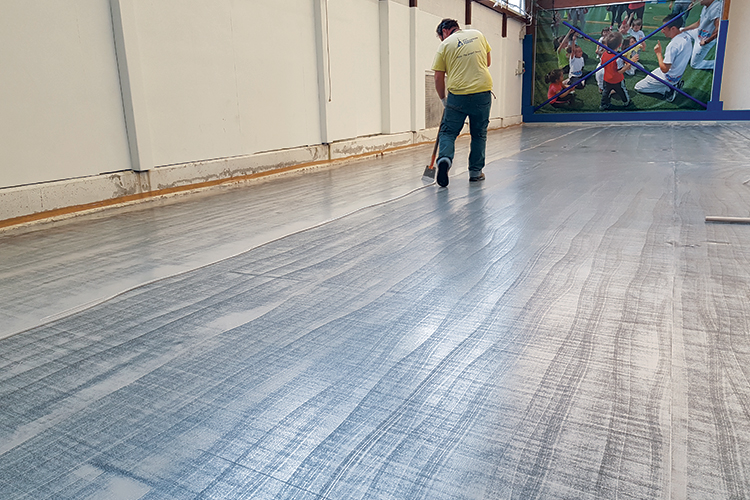 Fase 1: Encolado de la capa Spormat, de caucho reciclado de PFU, sobre lámina de PVC estabilizada Protector G13 mediante la utilización de la cola epoxi-poliuretánica bicomponente idónea Paste EP 11. Todo ello sirve para crear un soporte elástico, flotante e independiente de la subcapa