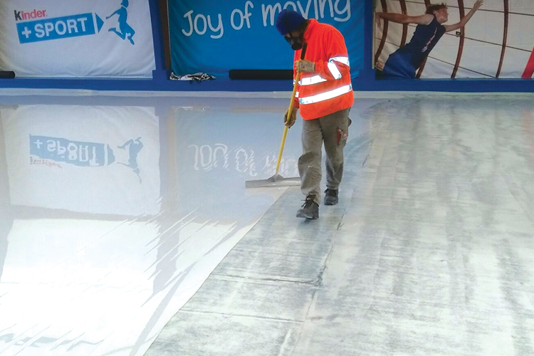 Fase 4: Aplicación con espátula dentada idónea de formulado poliuretánico bicomponente autonivelante especial denominado Pavisint SL 75 de unos 2 mm de espesor