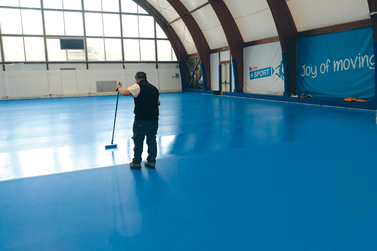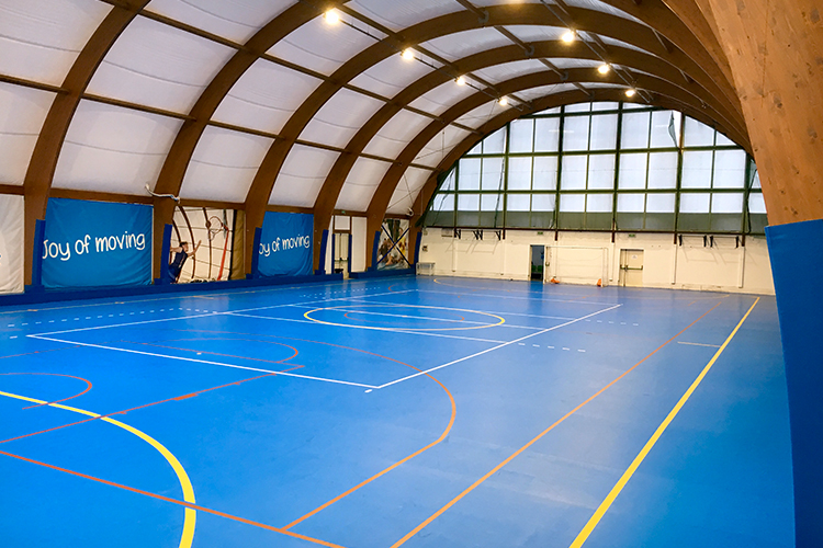 Realizada con el sistema Pavisint SL 75 FL de color Casali Azul Cielo P302, es una pavimentación de tipo flotante caracterizada por una capa de caucho reciclado de neumáticos en desuso (PFU), estabilizada con lámina de PVC y utilizando resinas de la máxima calidad. Está dotada de líneas para jugar al baloncesto, al voleibol y al minifutbol.