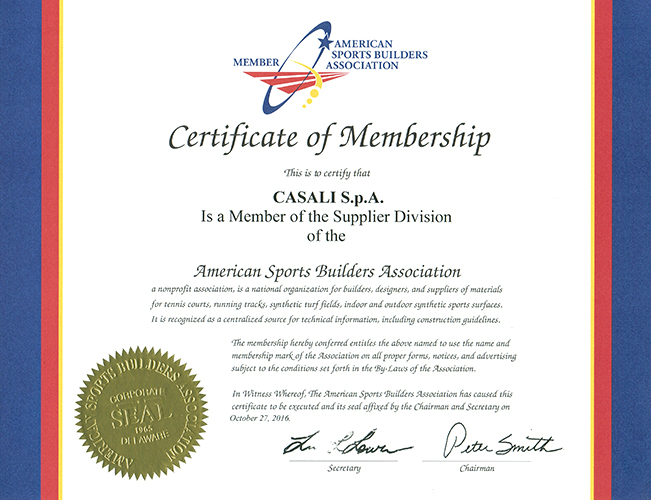 Dal 27 ottobre 2016 Casali è ufficialmente entrata a far parte dell’ASBA (American Sports Builders Association).