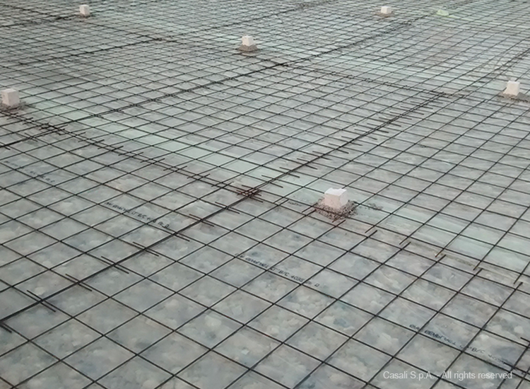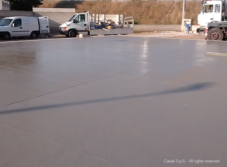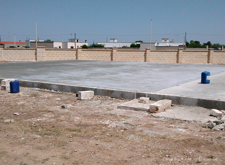 Fase1: sistemazione del terreno sottostante e realizzazione di massetto in calcestruzzo opportunamente progettato in termini di spessore, mix design, armatura di rinforzo, strato di usura superficiale e barriera al vapore contro umidità di risalita.