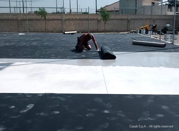 Fase 2: Trascorse le tempistiche necessarie alla corretta maturazione del massetto si è proceduto all'incollaggio dei tappetini in gomma granulare al supporto con speciale collante epossi-poliuretanico bicomponente PASTE EP11; l'operazione di incollaggio dei tappeti è fondamentale e deve essere fatta con estrema precisione ed accuratezza servendosi di personale specializzato e, se l'opera lo richiede, anche del supporto dell'Ufficio Tecnico CASALI SPORT.